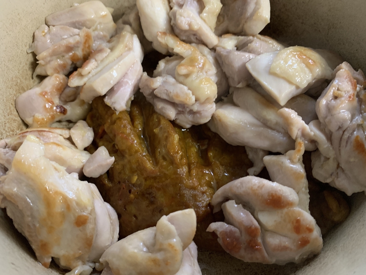 - 別のフライパンで鶏もも肉を焼く(少量の油(分量外)を敷いて、軽く焼き目がつくくらいに焼いた)