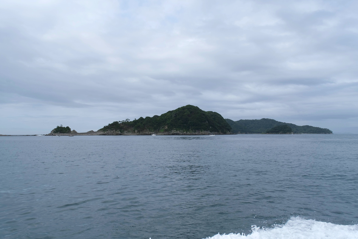 船から見る友ヶ島(沖ノ島、虎島、神島)。サマータイムレンダ1クール目のEDで、船から見た島の実写映像が出てくるけれども、正直同じような島の姿があったのかどうかはわからなかった。