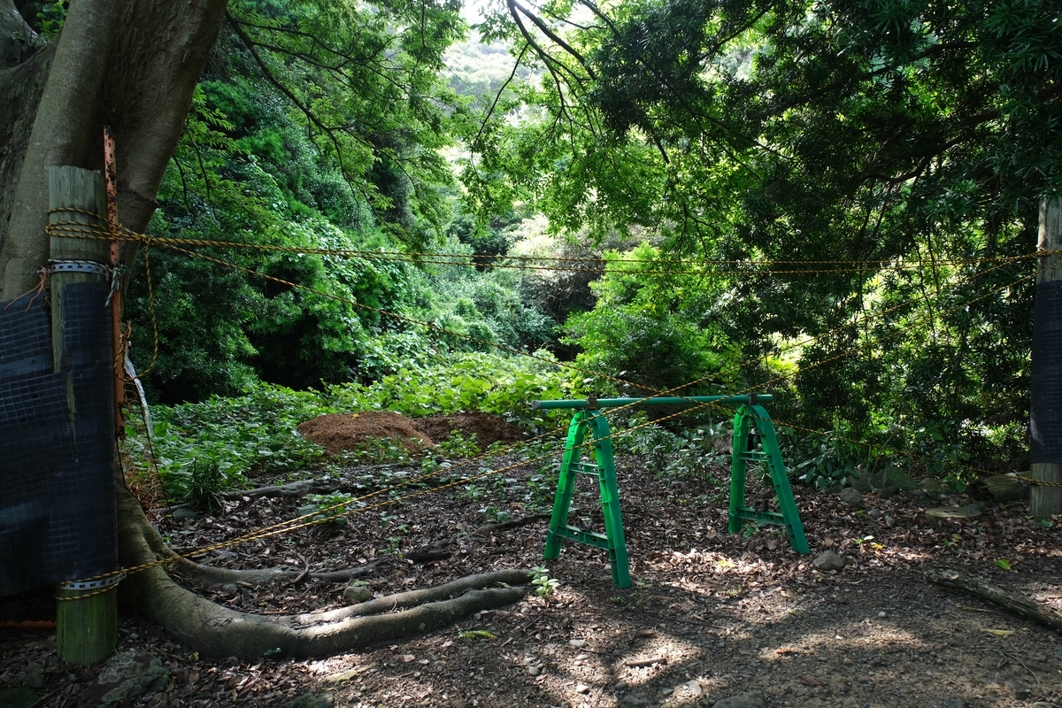 ここが沖ノ島の最高高度の地点(約120m)なので、周囲を見渡すことができる。沖ノ島東部と神島(左)。右奥に見えているのは虎島だ。この神島が巨大化して沖ノ島に繋がっているのが、多分サマータイムレンダ劇中の日都神社だ。