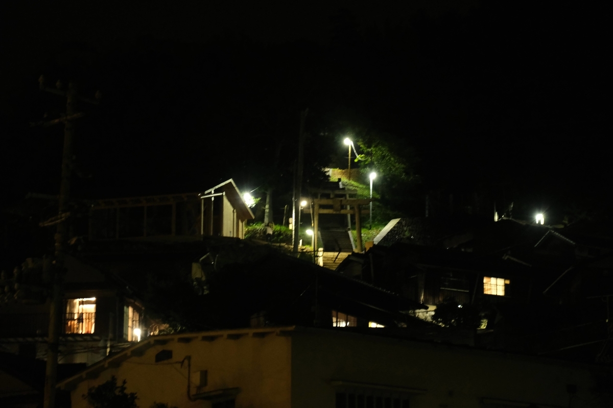 集落の一番上にある豊玉姫神社の鳥居が街灯に照らされている。