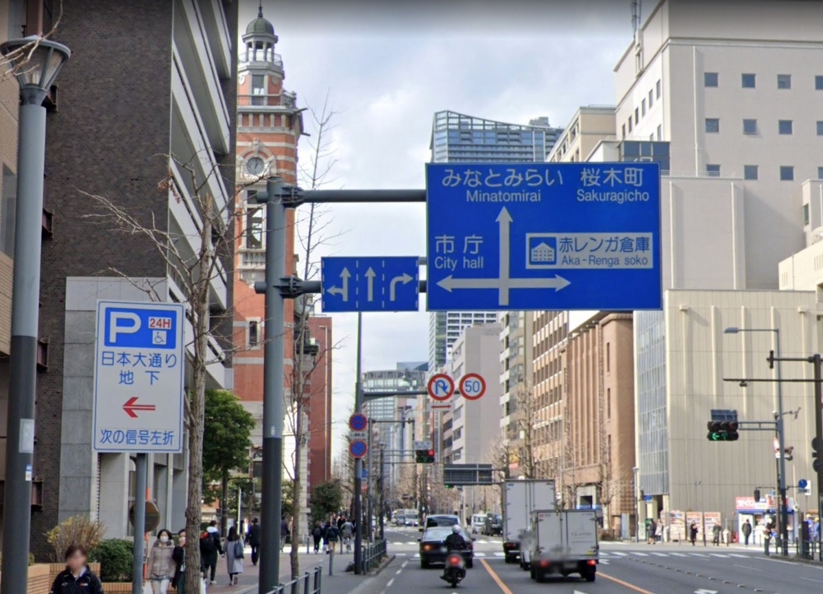 現在は横浜市開港記念会館が工事中で足場を組まれているため、ちょっとわかりにくいが、ストリートビューから2020年2月のイメージを持ってくるとこんな感じである(左右反転はしていない)。