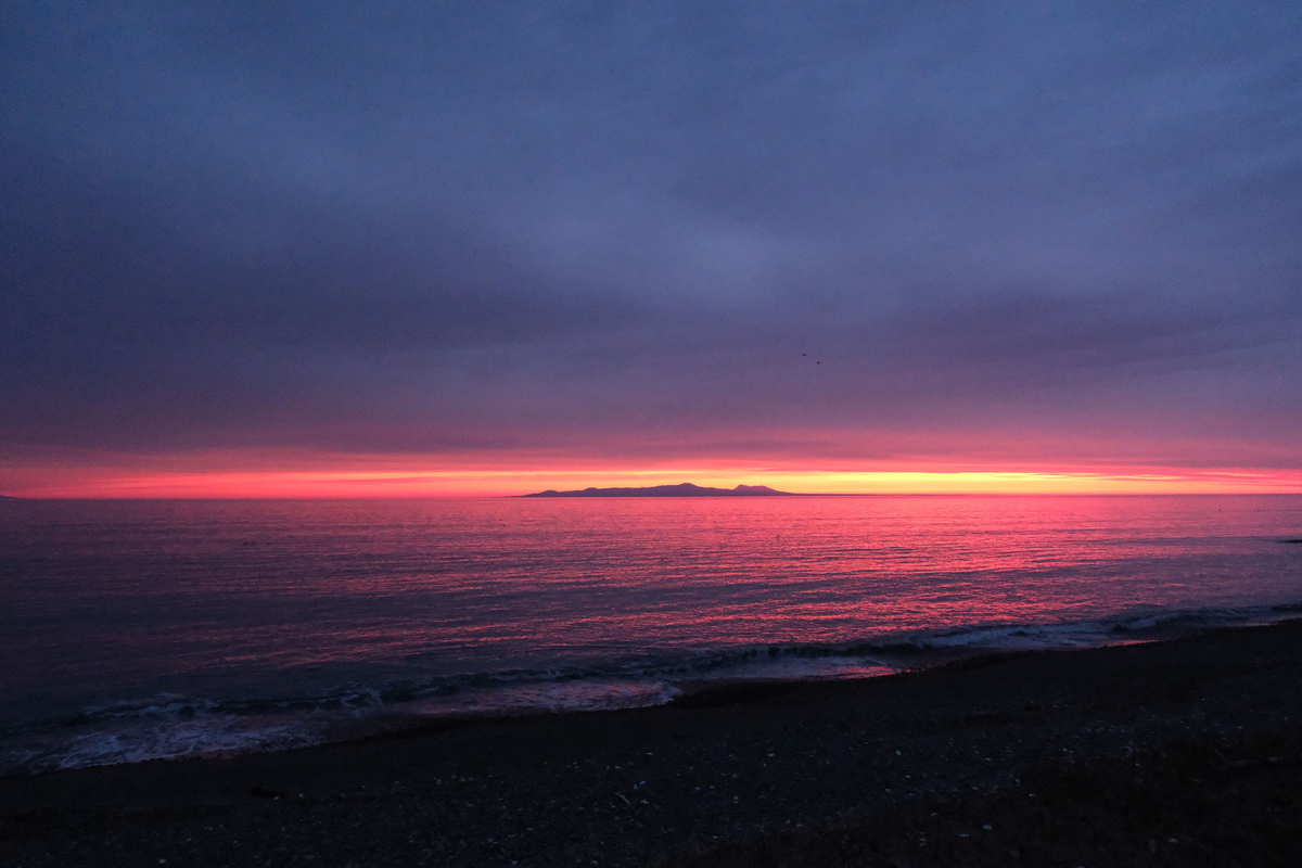空はかなり曇っていたのだが、水平線近くだけ晴れ渡っており、朝焼けが綺麗に見えていた。そしてその中に大きな島が見える。国後島である。