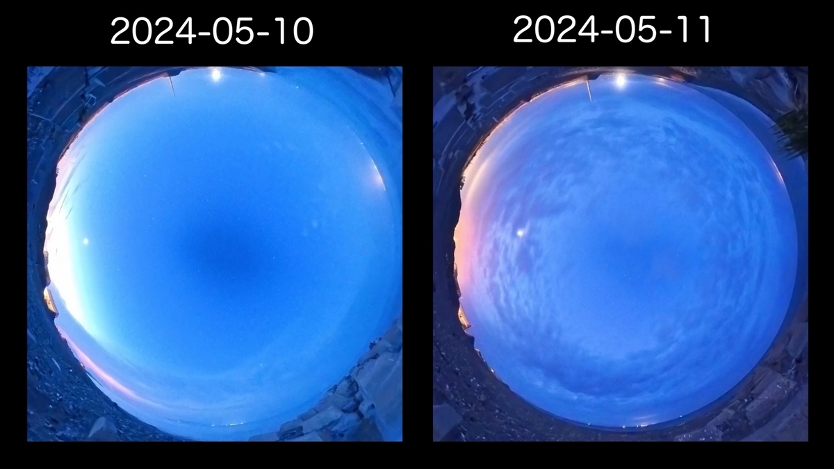 こうして同じ時刻の全天写真を比較してみると、特に3番目4番目の写真では、明らかに2日目の5月11日の方が全体的に紫色がかっていることが確認できると思う。