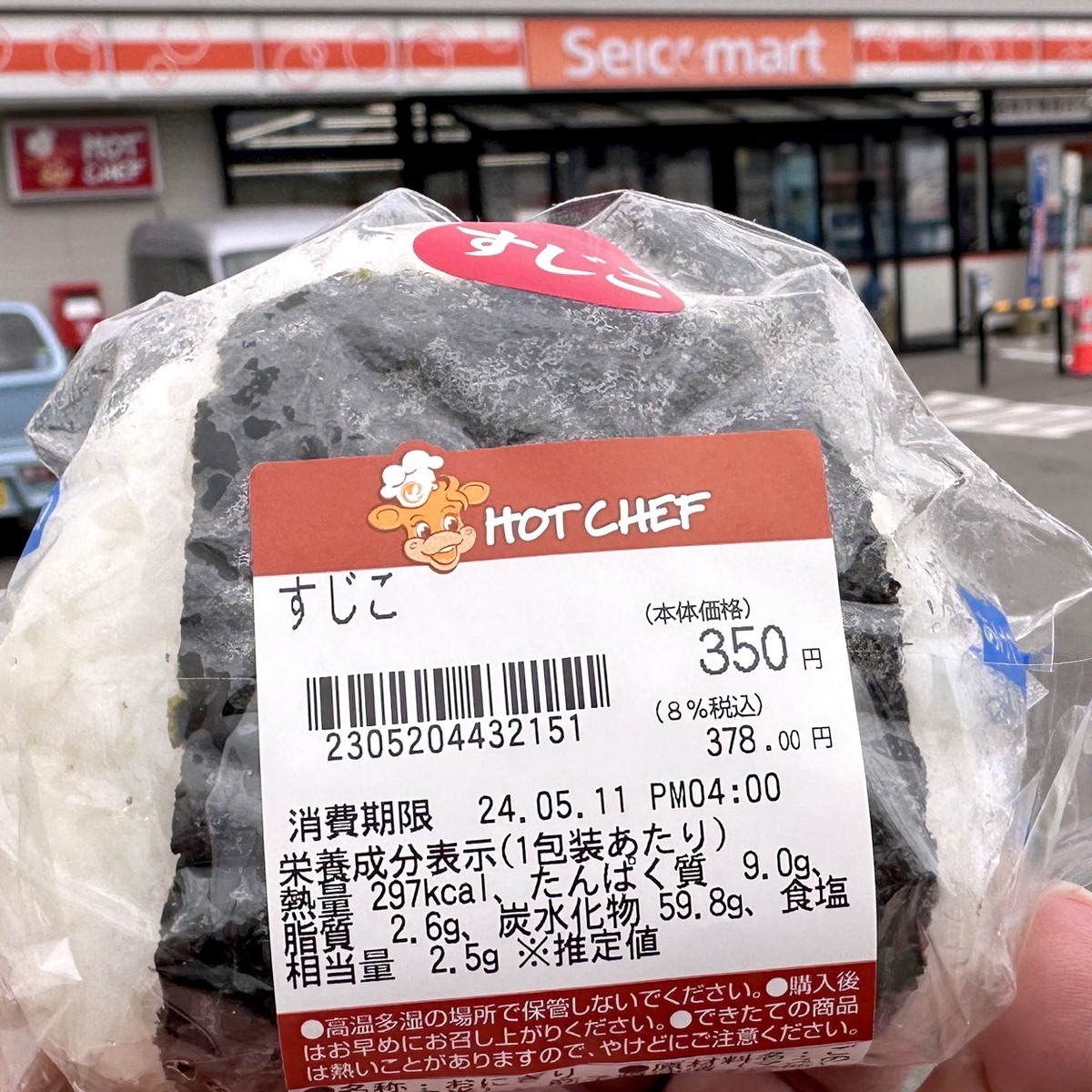 2日目の朝食は標津のセイコーマートで、ホットシェフのすじこおにぎりと、山わさびハムきゅうりサンド。